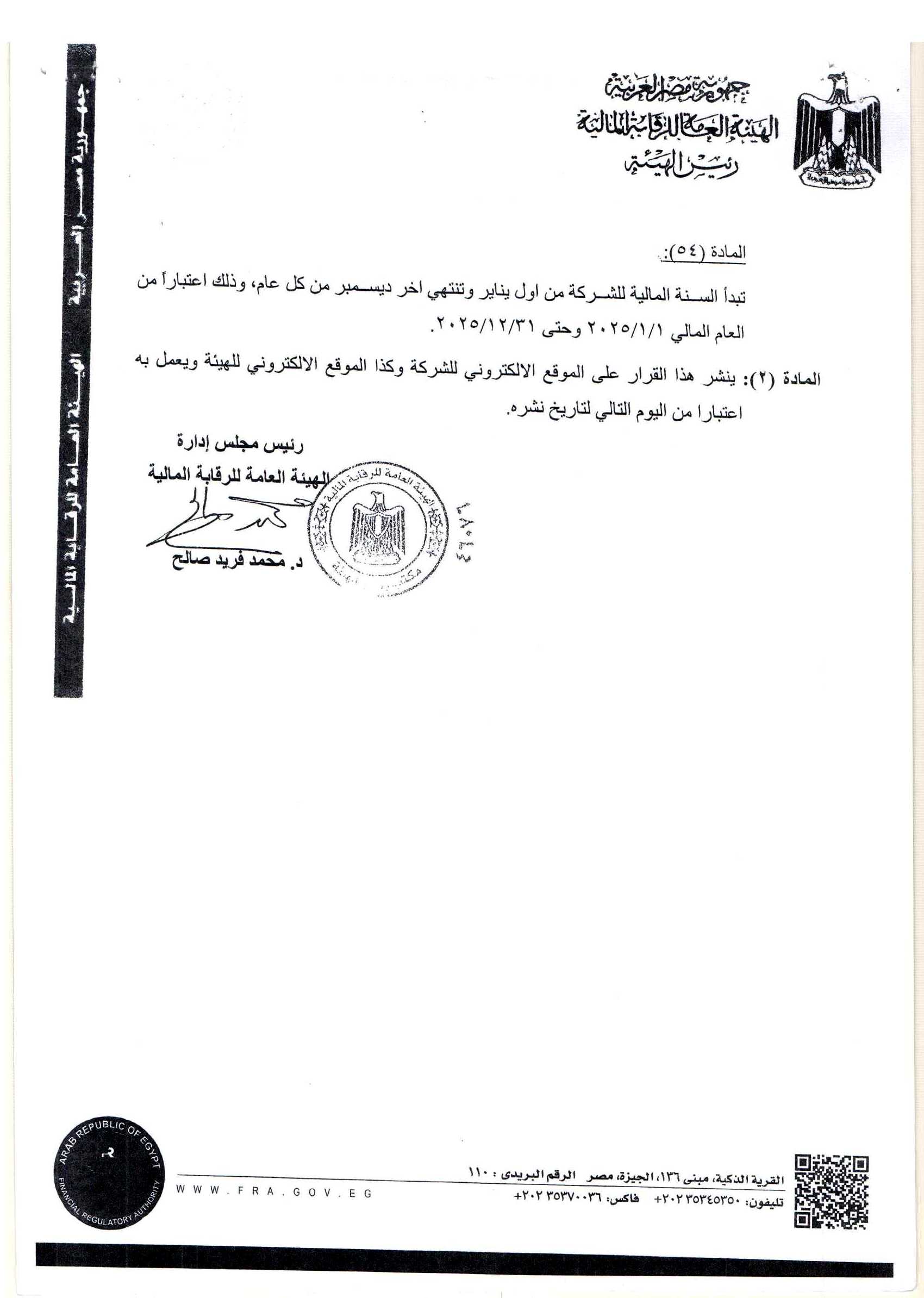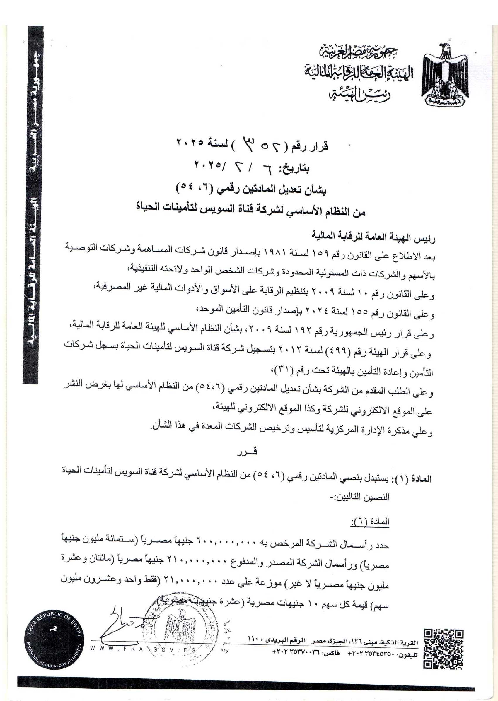 قرار الهيئة رقم 352 بتاريخ 2025/2/6 بالموافقة على تعديل المادتين رقمى 6 ، 54 من النظام الأساسى للشركة