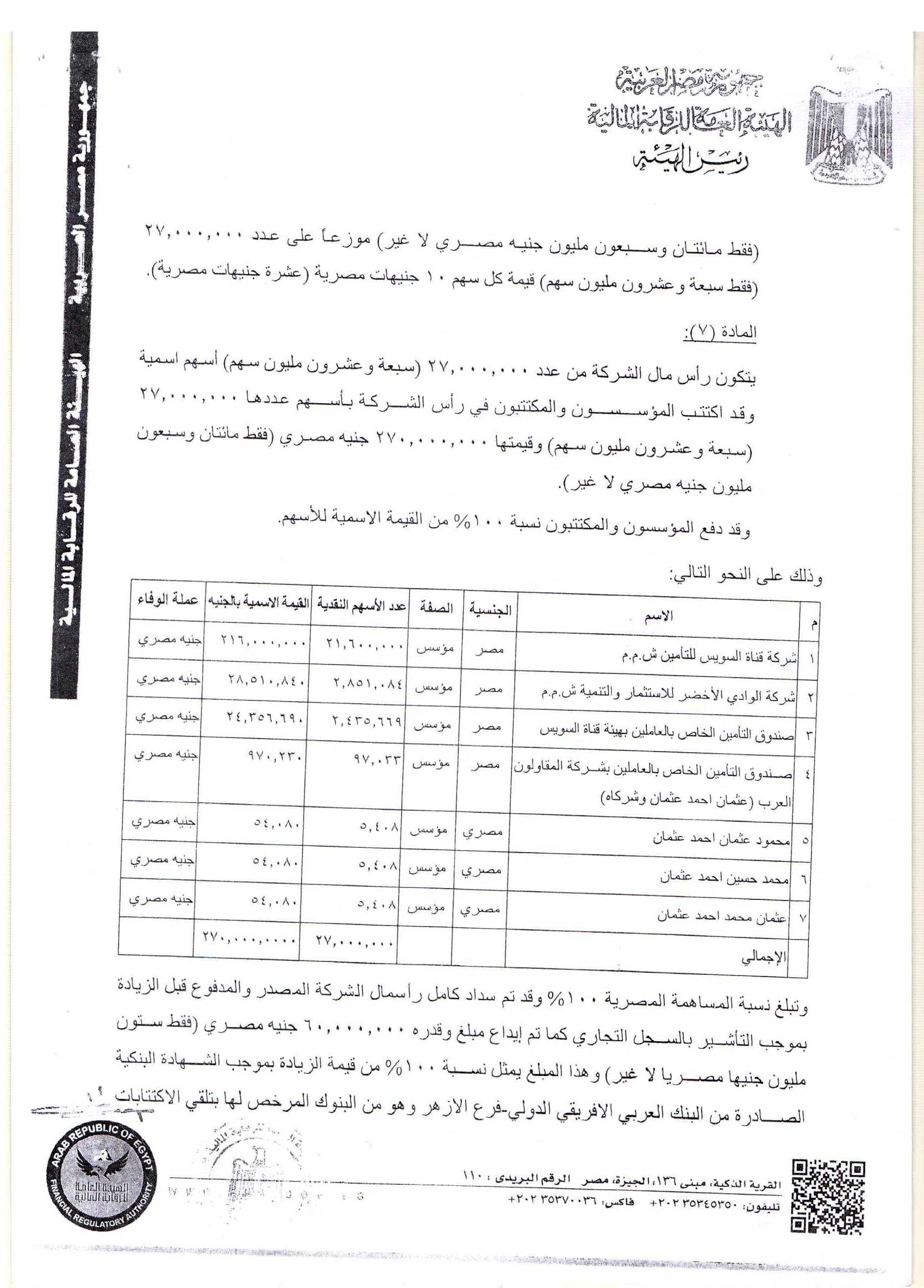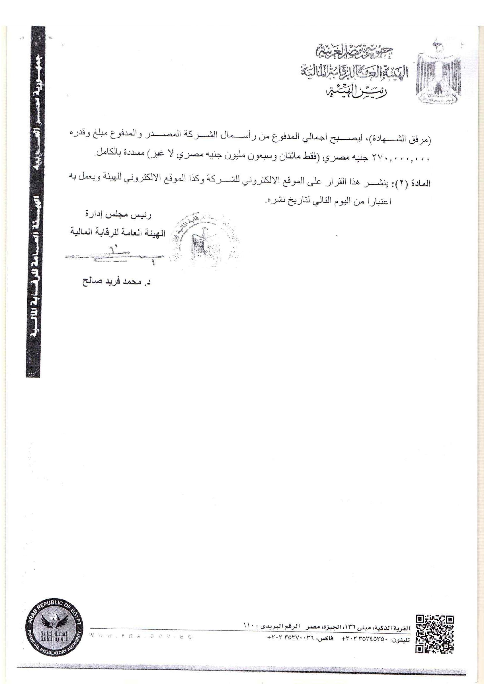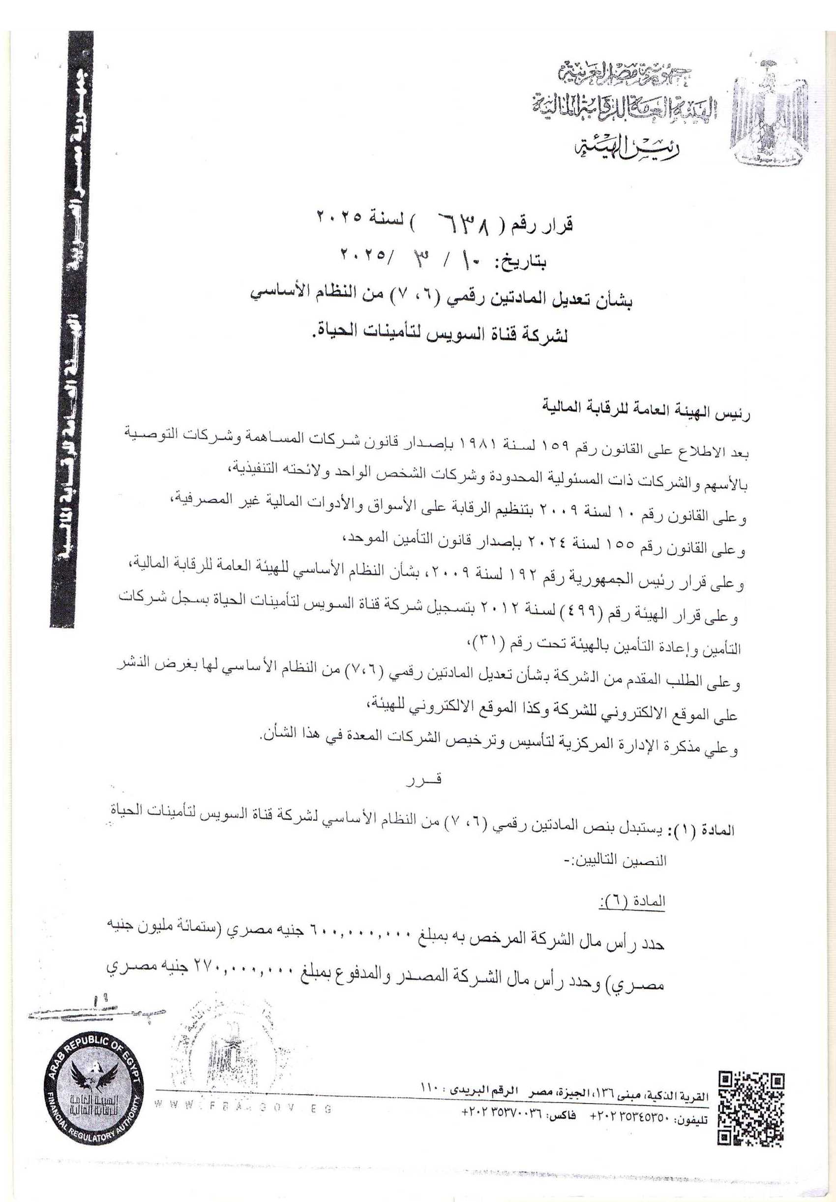 قرار الهيئة رقم 638 بتاريخ 2025/3/10 بالموافقة على تعديل المادتين رقمى 7،6 من النظام الأساسى للشركة
